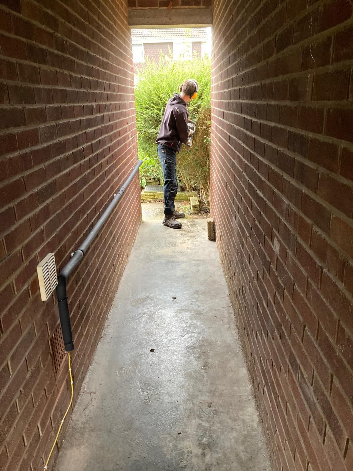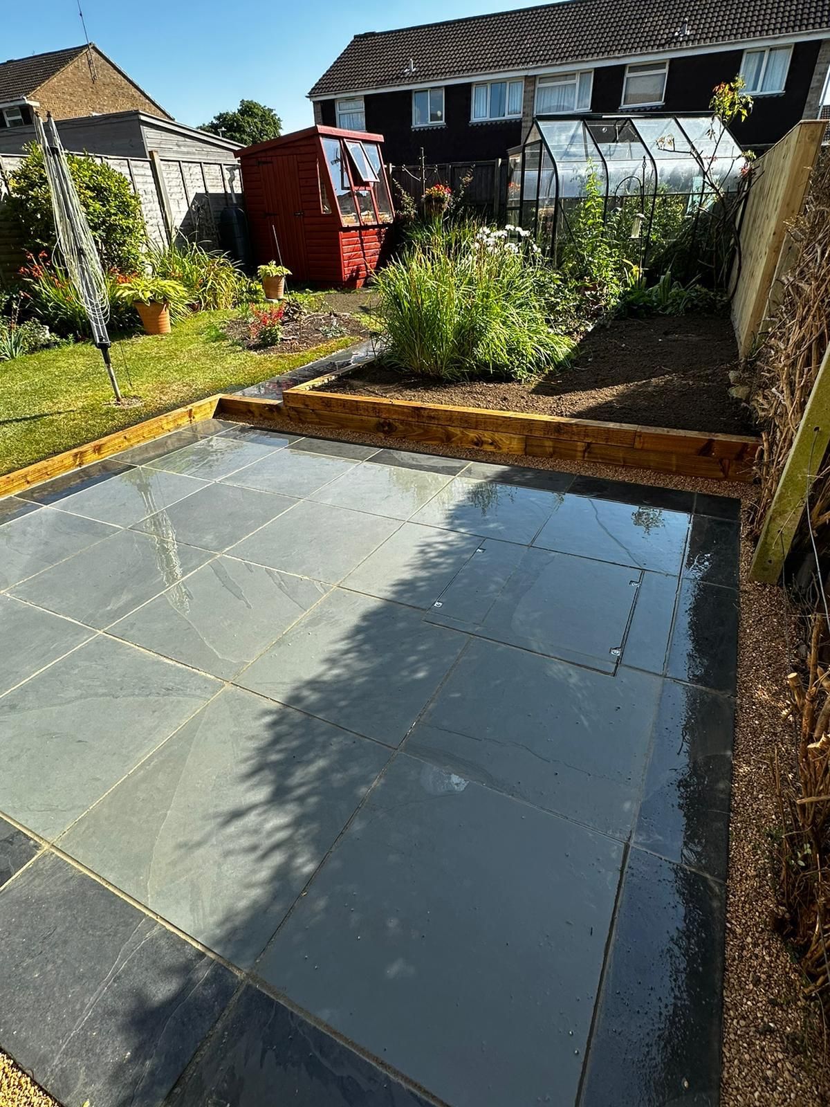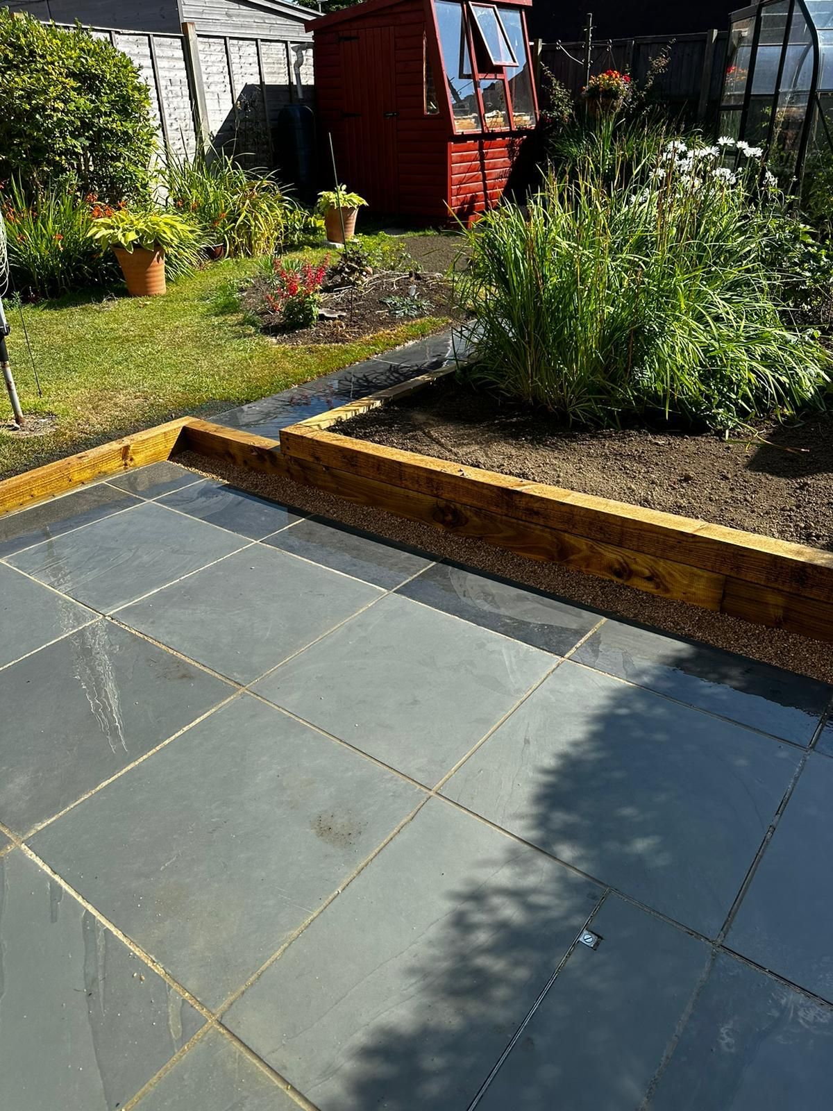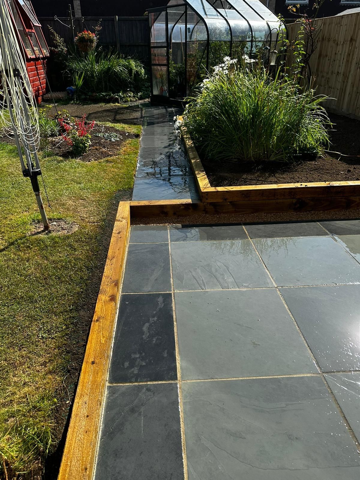 - Creating a usable space by cutting back the hedge, reducing the height of the drain and creating a raised planting area with a path to the exisitng greenhouse.